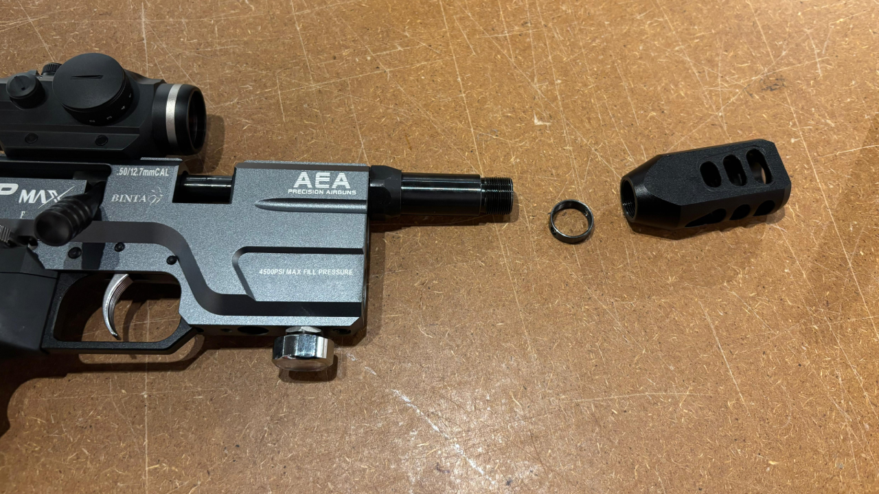 Nu kunnen we gemakkelijk de mondingsremmer losschroeven.