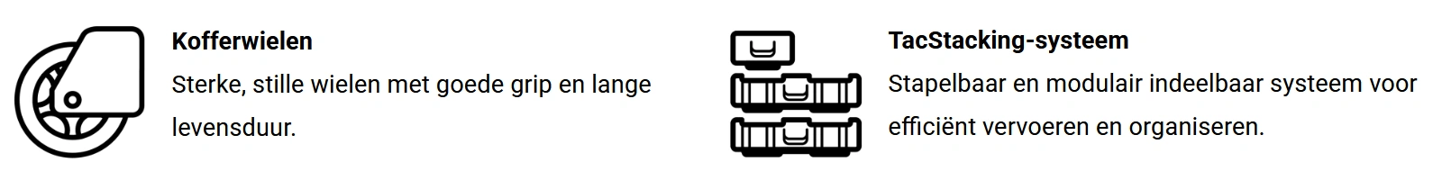De koffer is uitgerust met twee beschermende schuimlagen, robuuste wielen en heavy-duty vergrendelclips. Dankzij het TacStacking-systeem is hij bovendien perfect stapelbaar met andere Tacstack koffers.